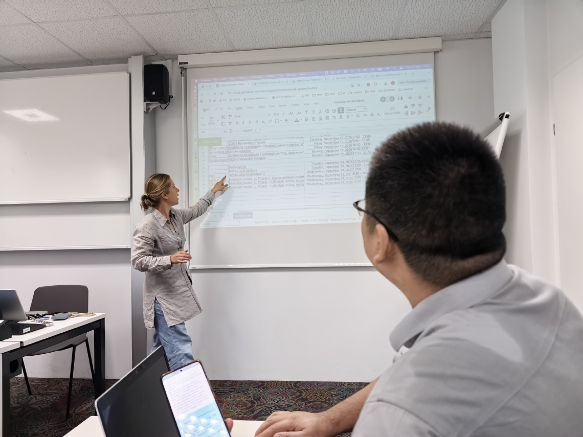 期间,两名教师与奥地利维也纳技术高等专业学院校长、计算机科学与数字技术学院院长Geyer教授,以及国际部主任Simone、人工智能和数据分析教研室主任Isabel博士等围绕课程共建、学分互认、师生互访、双语教学共建等进行深入交流。在教学交流环节,杨万里与奥地利维也纳技术高等专业学院教授Tobias开展了以“数据仓库和商业智能在工业物联网中的应用”为主题的英文公开课,赵晓东围绕“人工智能与机器学习”与当地学生进行了案例研讨与互动。