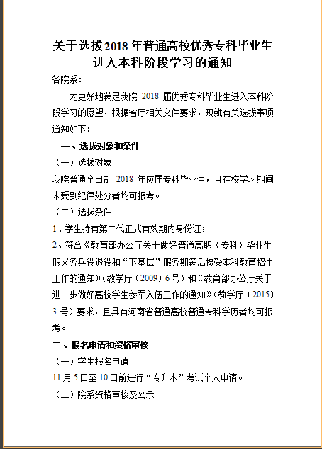 关于选拔2018年普通高校优秀专科毕业生进入本科阶段学习的通知