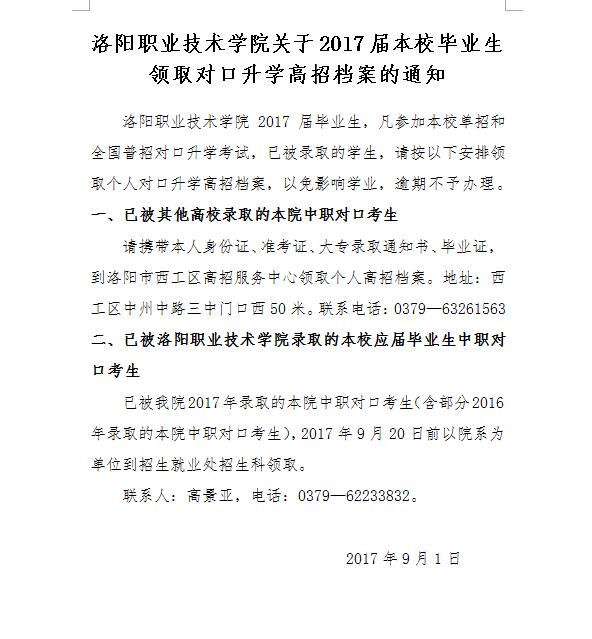 关于2017届本校毕业生领取对口升学高招档案的通知