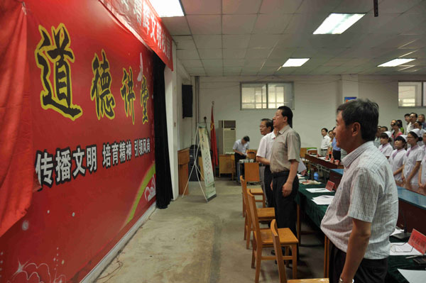 是日下午,道德讲堂正式开始。院领导孙敏、朱豫豪、杜跃钢、孙建勋各处室负责人、科级以上干部、医科职工、116名今年18岁的学生计330余人步入会场。活动由副院长朱豫豪主持,