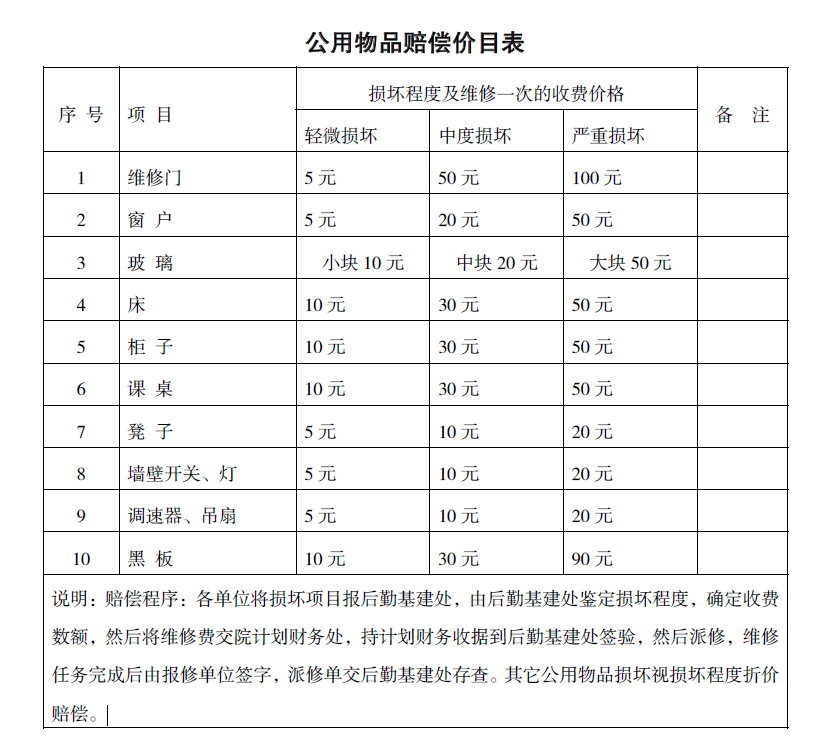 1.凡损坏学院公物,不能修复的,按全价赔偿;若能修复使用的,赔偿修理费用。若有意损坏,除赔偿全部费用外,要视情节轻重给予纪律处分。