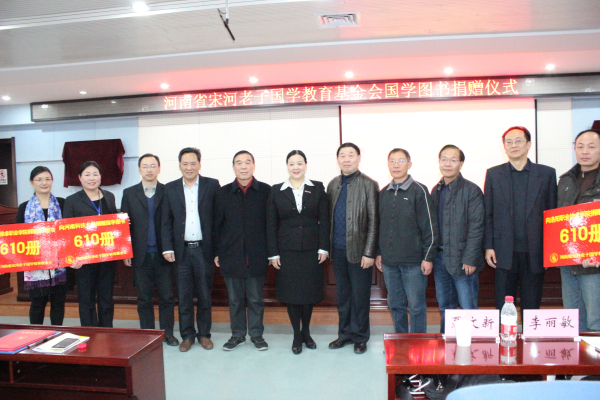2014年12月11日下午,河南省宋河老子国学教育基金会以“国学图书赠高校 圣贤经典励学子”为主题的捐赠国学图书大型公益活动在河南科技大学图书馆举行。出席本次活动的主要领导有:基金会副理事长兼秘书长、中共河南省委政策研究室原副主任、正厅级巡视员刘本在同志,河南省宋河老子国学教育基金会理事、河南省人社厅原副厅长韩世景同志,河南科技大学雷方副校长。捐赠仪式由河南科技大学图书馆孙海双馆长主持,洛阳地区四所高校的学校领导、图书馆领导,以及图书馆馆员和学生代表参加了捐赠仪式。