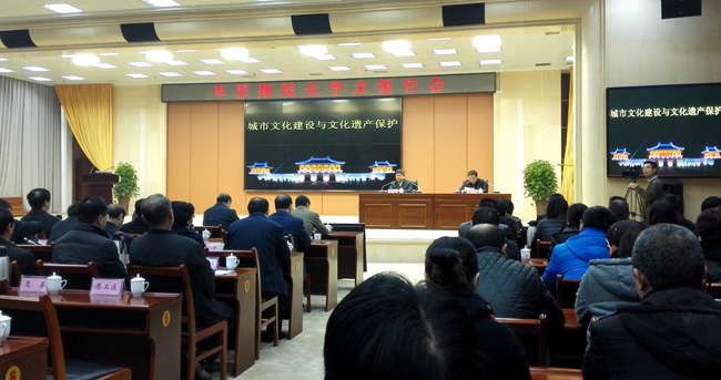 12月11日上午,故宫博物院单霁翔院长学术报告会在洛阳市会议中心举行,市委副书记、市长鲍常勇主持报告会。市领导王立林、杨炳旭、史秉锐、高义、王树仁、陈卫平、陈淑欣、谢留峰等和400余名机关干部、群众一起,聆听了题为“城市文化建设与文化遗产保护”的报告。我院李大伟书记带领党政办、东方文化创产学院的同志参会。