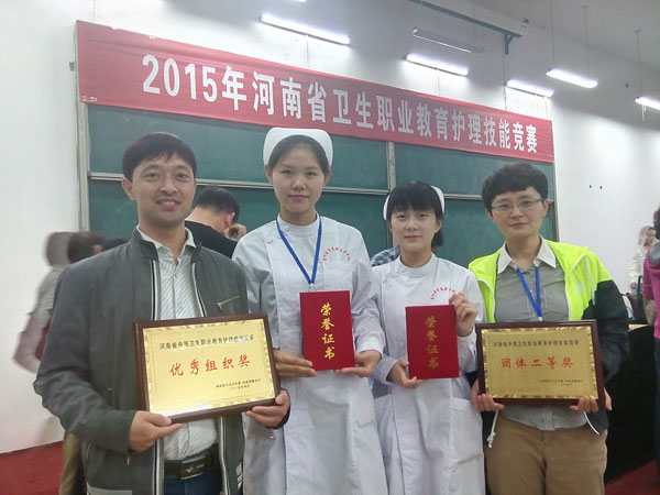 4月21日至29日,我院选拔的6名学生选手参加了2015年河南省卫生职业教育护理技能竞赛。代表我院中职组参赛的选手张贤君、李舒鑫、化艺凡分别获得个人一、二、三等奖,辅导教师陈利颖、刘晶晶分别获得“优秀辅导教师”殊荣,我院获得团体二等奖和优秀组织奖;代表我院高职组参赛的选手王艺和刘玥分获个人二等奖、李雯瑞获得个人三等奖,辅导教师尚艳芳、王瑞丽分获“优秀辅导教师”,我院获得团体二等奖和优秀组织奖。