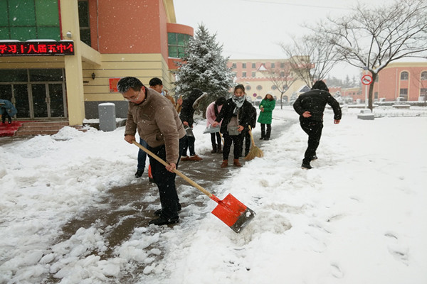 学生管理处组织学生干部扫雪,尽管天气寒冷,学生们干劲十足、热情高涨,在大家的齐心努力下,校园内的积雪被清除。