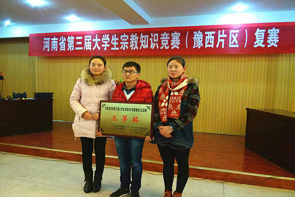 12月10日,河南省第三届大学生宗教知识竞赛(豫西片区)复赛在河南科技大学落下帷幕,共有11所高校参加比赛,我院2015级大专新生马新妞、郭帅帅、常方圆代表学院参赛最终以小组赛第二名,复赛第四名的总成绩荣获三等奖。