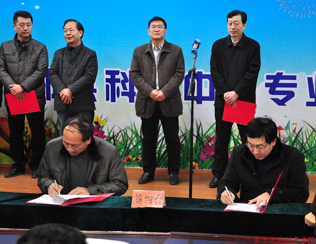 副院长孙建勋与郏县科技中专校长韦六锋签订2016年“3+2”分段制高等职业教育联合办学协议。
