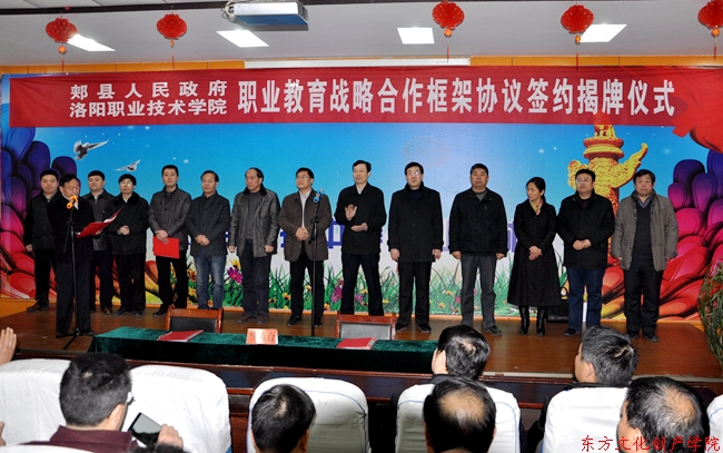 1月28日上午,在平顶山市郏县科技中等专业学校举行了洛阳职业技术学院和郏县人民政府《实施职业教育战略合作框架协议》以及与郏县科技中等专业学校“3+2”分段联合办学协议签字仪式。我院党委书记李大伟、院长程相朝、副院长孙建勋、纪委书记王晓哲,郏县人民政府县长杨英锋、副县长李国英、党组成员、副县级干部康应振、县直有关单位负责人以及我院党政办、教学处、科研外事处、宣传(统战)部、招生就业处等相关负责人参加了签约仪式。