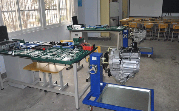 二级维护实训室2个(面积约400㎡)、汽车故障综合诊断实训室1个(面积约108㎡)、发动机拆装实训室4个(面积约500㎡)、空调实训室1个(面积约108㎡)、电控发动机故障诊断与排除实训室4个(面积约540㎡)、自动变速器故障诊断与排除实训室4个(面积约500㎡)、自动变速器折装与检修实训室2个(面积约170㎡)、底盘传动系实训室1个(面积约110㎡)、底盘制动系实训室1个(面积约110㎡)、底盘转向系实训室1个(面积约110㎡)、汽车电器设备检修实训室4个(面积约500㎡)、仿真实训室2个、仓库实习材料存放区(面积约150㎡)。可满足本系师生进行汽车专业课理论与实践一体化教学。