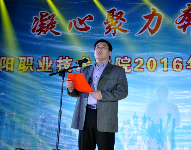汇演开始前,院党委书记李大伟发表了热情洋溢的新年致辞。他首先代表学院党委、学院领导班子,向关心学院发展的各级领导,向支持我院发展的各界朋友,向辛勤工作的教职工,向努力学习、奋发向上的同学们致以新春的祝愿和诚挚的问候!他在讲话中指出,回眸2015年,成功和喜悦交织,梦想与希望同在。过去的一年,是聚力发展、昂扬奋进的一年,更是艰苦奋斗、砥砺前行的一年。这一年,在市委市政府的正确领导下,在社会各界的关心支持下,在全体师生的共同努力下,学院以迎接教育部人才培养工作评估为中心,坚持党委领导下的校长负责制和依法治校两项原则,围绕“新校区建设、内部管理提升、外部环境优化”全面开展工作。这一年,我们以十八届四中、五中全会精神为指导,深入贯彻习近平总书记重要讲话精神,扎实开展“三严三实”专题教育,不断加强领导干部思想和作风建设。这一年,我们配齐了领导班子、调整了学院中层、完成了在编人员的“三定”。 这一年,我们委托中国政策科学研究会,邀请国家发改委、教育部、人社部、财政部、国家开发银行等十几个国家部委共同为我院制定了《洛阳职业技术学院战略发展规划》,为我院明确了战略定位和发展方向。这一年,我们深化学院体制改革,全力推行院系二级管理,建立起二级财务预算办法等管理机制。这一年,我们广纳良才,面向社会公开招聘了34名硕士研究生,不仅充实了教师队伍,也为学院发展提供了人才支撑。这一年,我们强化校企合作,坚持内引外联,与美国、以色列等国际院校、中国劳动保障科学研究院、北京师范大学、人民网等单位洽谈联合办学,与中国汽车工业工程有限公司、故宫博物院研究院、沪江网及洛阳沃德福机器人科技有限公司、洛阳源彩旅游公司、洛阳灵E睿科技有限公司、洛阳中州国际酒店等知名企业深度合作,共谋发展,合作共赢。这一年,新校区建设取得突破性进展,在伊川县境内为我院规划了2500亩用地,目前,已完成了新校区一期规划设计方案初评,项目申请报告获市发改委批准立项,环境评价已通过专家评审,德国促进银行贷款申请已上报国家发改委,PPP申请已上报省财政厅,我院迁建方案正在等待市政府批准。这一年,学院上下齐努力,以热情与汗水投入省级文明单位的创建工作中,现在创建工作已通过市级验收,上报省文明办。这一年,我们以服务洛阳经济为己任,积极申报新能源汽车制造与维修、机器人制造与维修、文物修复与保护、养老护理等特色专业。这一年,经过探索与实践,我们确定了“实施八一工程,培养大国工匠”的办学纲略,确立了“六心育人”的创新管理模式。在市委组织部进行的业绩考核中,学院领导班子在全市名列前茅,得到市委、市政府的充分肯定。学院的办学纲略、发展目标和取得的工作成效也得到了省委高校工委、省教育厅主要领导的肯定和支持。可以自豪地说,这一年,学院各项工作开展得扎扎实实、有声有色,学院呈现出政通人和、风清气正,团结奋进,共谋发展的良好局面。