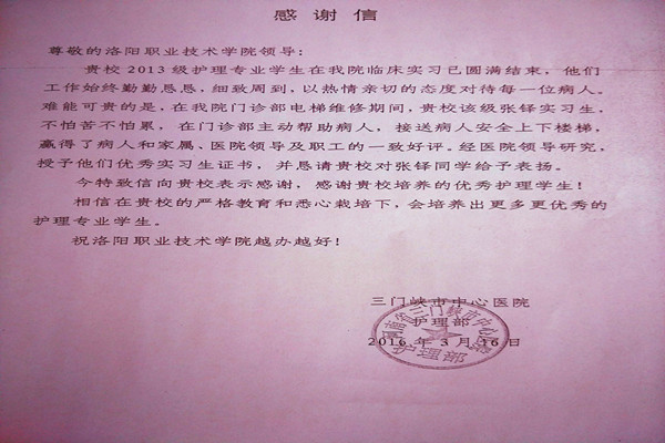 临近实习结束,学生陆续返校。我院2013级护理专业学生张铎不但圆满结束实习,还被实习点三门峡市中心医院评为优秀实习生,并寄感谢信一封。