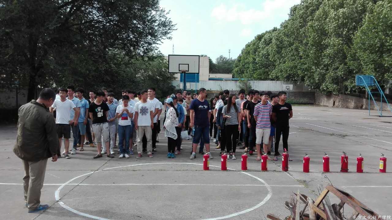 昨天下午四点半,我院学生在学院侯贤俊、张意佳、贾亦真等老师的带领下,秩序井然地来到操场演习集合地,签到完毕后,全院学生安静地等待演习的开始。四点五十分,演习正式开始。此次演习分为三部分:一、灭火器的使用方法介绍。学院保卫处王副处长认真地介绍了干粉试灭火器的使用方法,包括1.首先要检查灭火器是否在正常的工作压力范围;灭火器压力表分为三个颜色区域,黄色表示压力充足,绿色表示压力正常,红色表示欠压;一般选用灭火器指针至少要在绿色区域,否则就需要到安监部门充压;2.将灭火器上下颠倒几次,使里面的干粉松动;3.拔掉保险销;一般为铅封或者塑料保险销,直接用手拉住拉环,使劲向外拉就可以将保险销拉掉;4.拉掉保险销后,一只手握住压把,另一只手抓好喷管,将灭火器竖直放置;当用力按下压把时,干粉便会从喷管里面喷出;5.喷射时,要对准火焰根部,站在上风向离火焰根部距离3米左右。介绍完毕后,王副处长又亲自示范,使全体学生准确了解了灭火器的使用方法和要领。二、点燃易燃物及操作灭火。讲解并示范过灭火器之后,保卫处工作人员安排全体学生散开后,点燃了事先准备好的易燃物,等火苗蔓延开来后,学生们在老师们的带领下亲自拿起灭火器将大火成功扑灭。三、演习总结及离场。大火被成功扑灭后,保卫处王副处长宣布这次演习取得圆满成功并对参与灭火的全体学生提出表扬。全体学生在老师的带领下有条不紊地离开了操场。