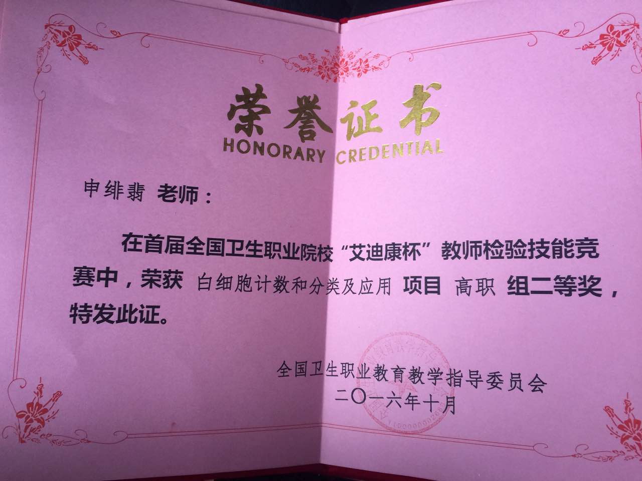 日前,首届全国卫生职业院校“艾迪康杯”教师检验技能竞赛在贵州省铜仁市举行,我院药学与检验系申绯翡老师参加竞赛。经过激烈角逐,申绯翡老师在白细胞计数和分类及应用项目比赛中获高职组第5名,二等奖第一名的成绩。