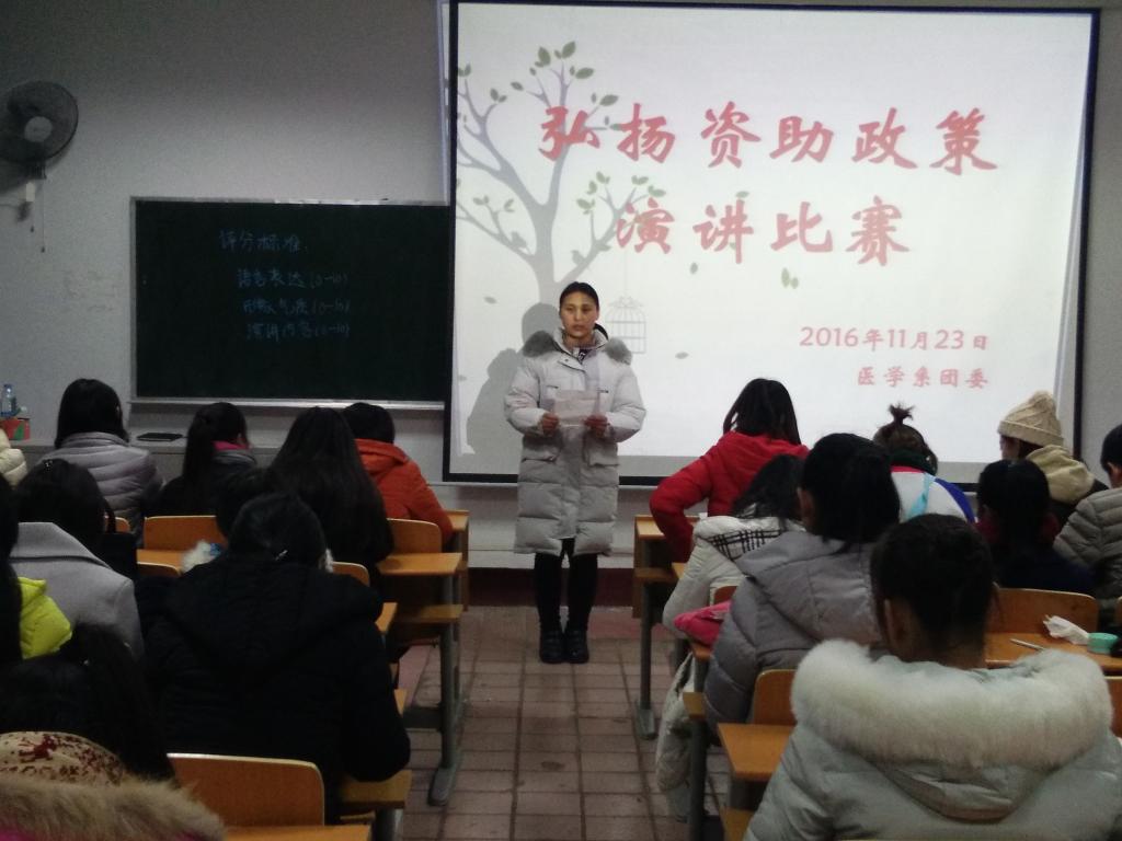 在院团委的指导下,为了让更多的同学了解国家资助政策,同时彰显大学生风貌,培养大学生诚信感恩精神。进一步加强学院校风,落实有关学生资助工作精神,加强学生的自尊自强自信和自立意识,培养以德立身,明礼诚信,自强不息的新时代大学生,构建和谐互助的美丽校园。医学系于2016年11月23日晚在机场路校区北院第五多媒体开展了“弘扬资助政策演讲比赛”活动。