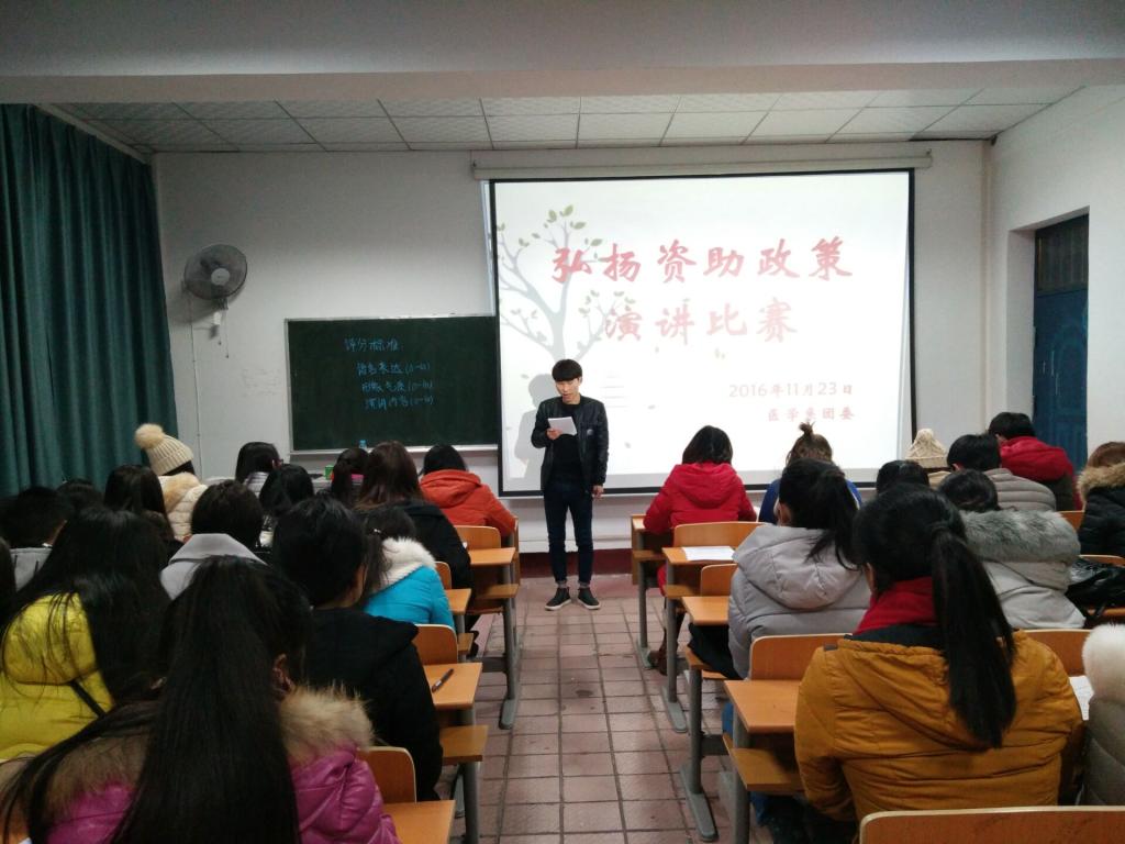 医学系各个班级享有资助的同学以“弘扬资助政策”为主题进行了演讲比赛,他们深刻讨论了励志成才之间的关系和对人生的意义,有同学说:“正当我无奈之时,老师告诉我一个好消息,就是申请国家助学金,国家助学金让我们不再为那巨款学费而忧心忡忡,更不用因为学费之事而走访亲朋好友,甚至不用在电话里低声下气的向亲戚诉说学费之苦,国家助学政策为我排忧,给我带来新希望”。他的演讲说出了我们的心声,让我们感受到了国家对贫困生的关怀。