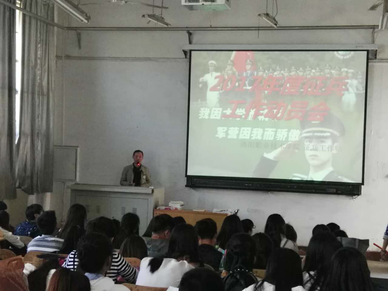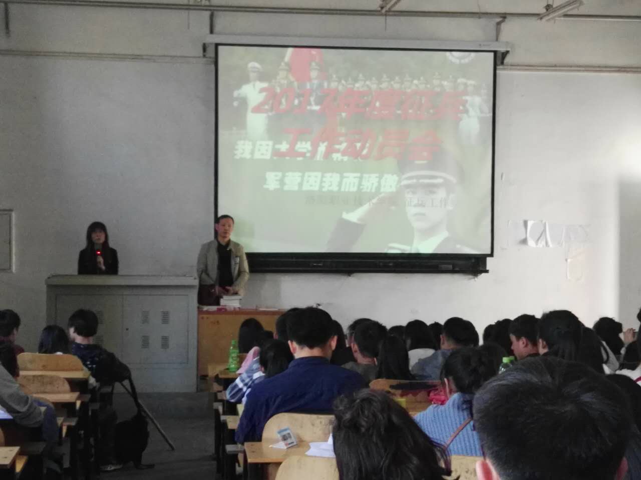 为认真贯彻落实国防部征兵办公室、省教育厅及我校征兵工作相关要求,扎实做好我系学生征兵宣传动员工作,营造大学生征兵工作良好氛围,践行我院“爱党报国”的校训,药学与检验系抓住2014级学生返校参加毕业考试的有利时机,主动联系安全保卫处田应功处长于4月22日(周六)下午在机场校区红山院对返校学生进行征兵动员。大会由我系党总支朱莉书记主持并做动员,田处长做了征兵工作宣传及讲座。