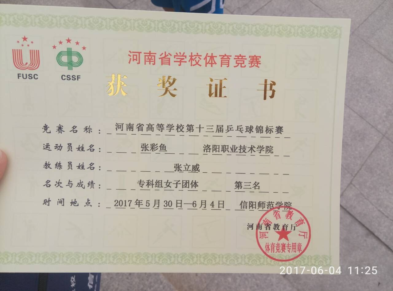 2017年河南省高等学校第十三届乒乓球锦标赛于5月29 -6月4日在信阳师范学院校区举行。药学与检验系2016级大专药学1班学生张彩鱼作为我院参赛代表团成员参加了角逐,经过奋力拼搏,获得河南省专科女子团体三等奖的优异成绩,这也是我院首次在省级乒乓球比赛中获得殊荣。
