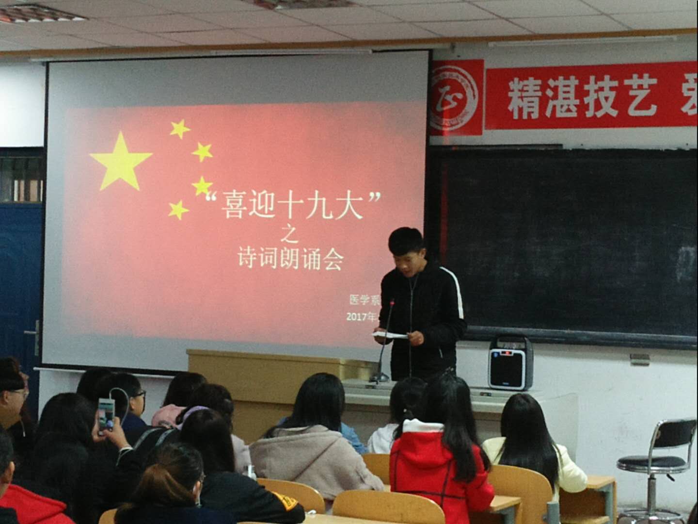 在院团委(学生处)的指导下,为激发全体学生的爱党爱国情怀,唱响时代主旋律。我系于2017年10月17日在机场校区北院进行了由医学系辅导员马侨丹主持的“喜迎十九大”诗词朗诵会。