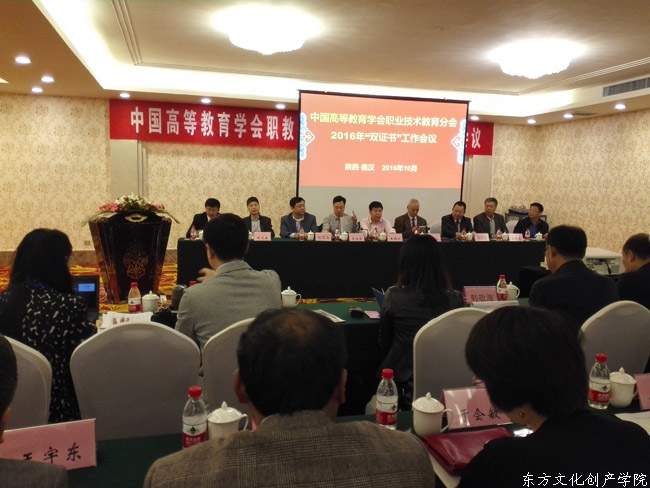 2016年10月22日,中国高等教育学会职业技术教育分会2016年“双证书”工作会议在西安咸阳隆重召开。程相朝院长作为双证书委员会副主任委员出席会议,张战杰处长、东方文化创产学院常务副院长王伟浩一起参会。