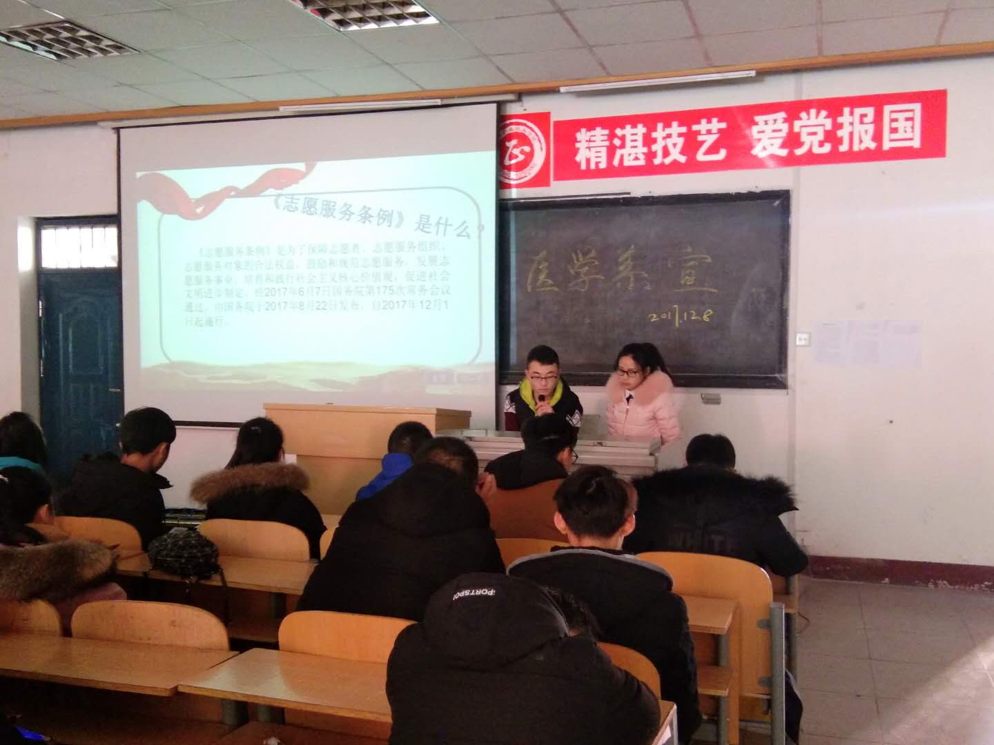 为了让同学们了解志愿者活动,明白志愿者精神,积极参加志愿者活动。我系于2017年12月8号在机场路北院第一多媒体开展了“志愿者服务条例”知识讲座。