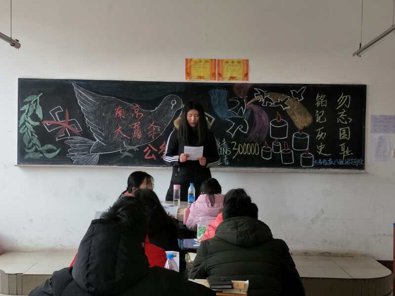 1937年12月13日,侵华日军野蛮侵入南京,制造了惨绝人寰的南京大屠杀惨案,短短六周,30万同胞惨遭杀戮。团支书用沉重的口吻将同学们的情绪代入到那个久远的年代,让同学牢记国家过去的耻辱,告诫同学们开展此次活动不仅是为了唤醒同学们对这段耻辱历史的记忆,更是希望同学们做到前事不忘后事之师,化悲愤为力量,将自己的理想与志向体现到实际行动上。