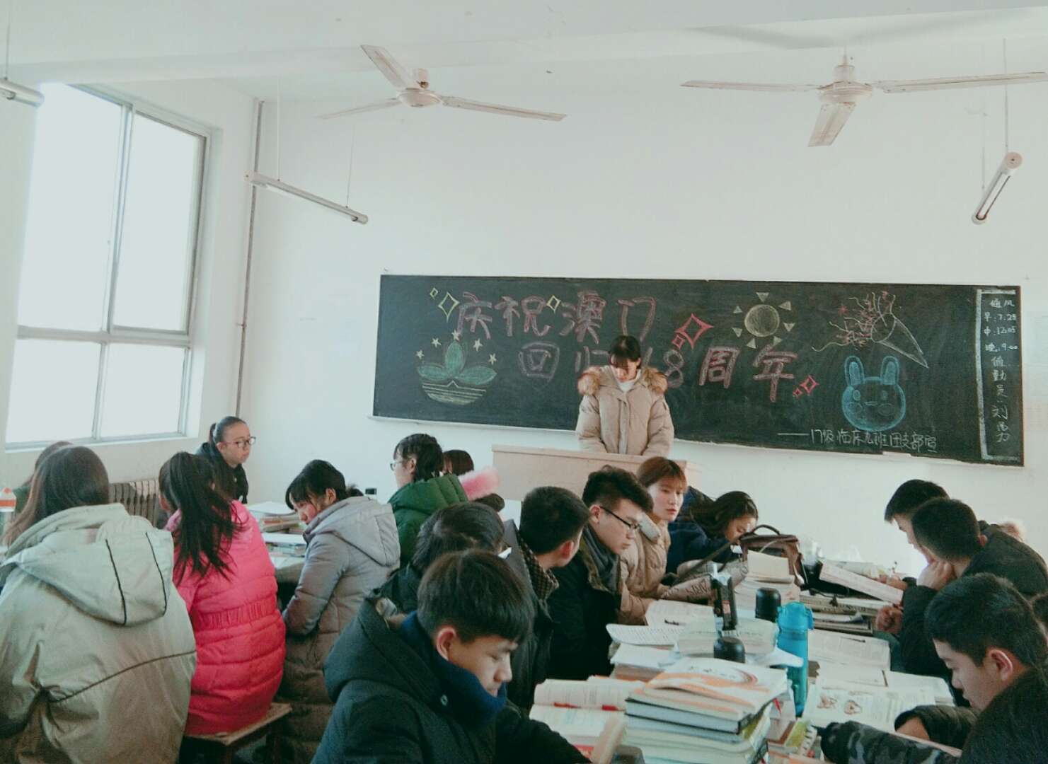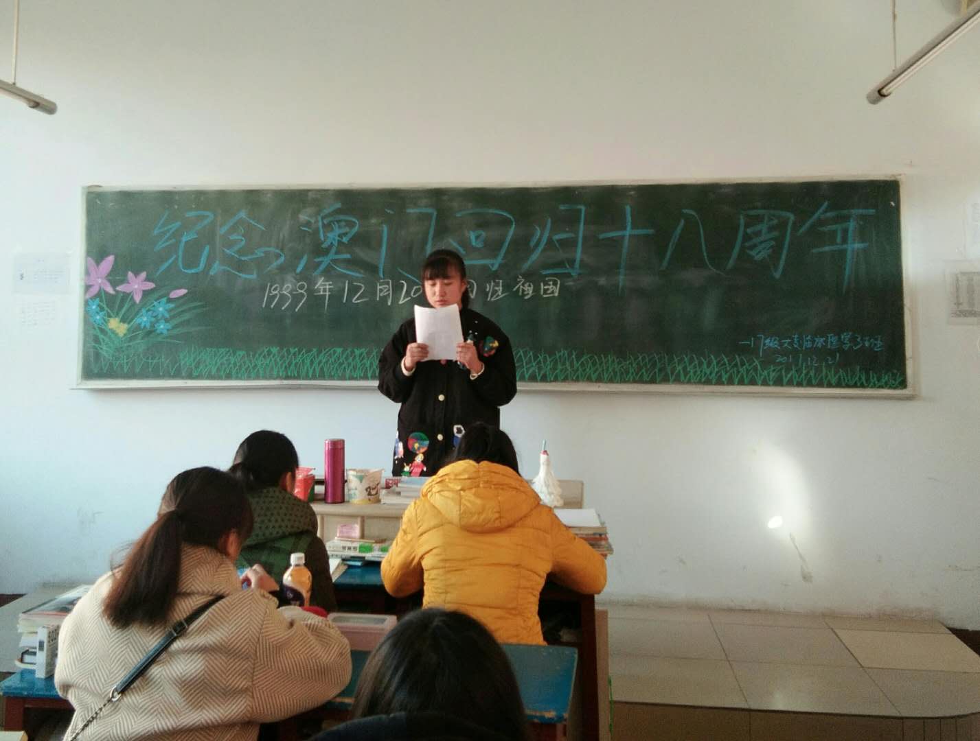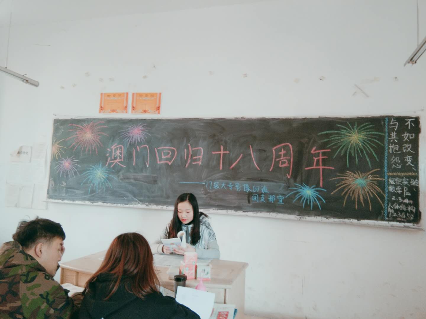 1 999年12月20日零时一声呐喊在澳门上空回荡母亲,我回来了!2017年12月21日,我系在机场校区北院举行了以“纪念澳门回归18周年”为主题的团课教育。