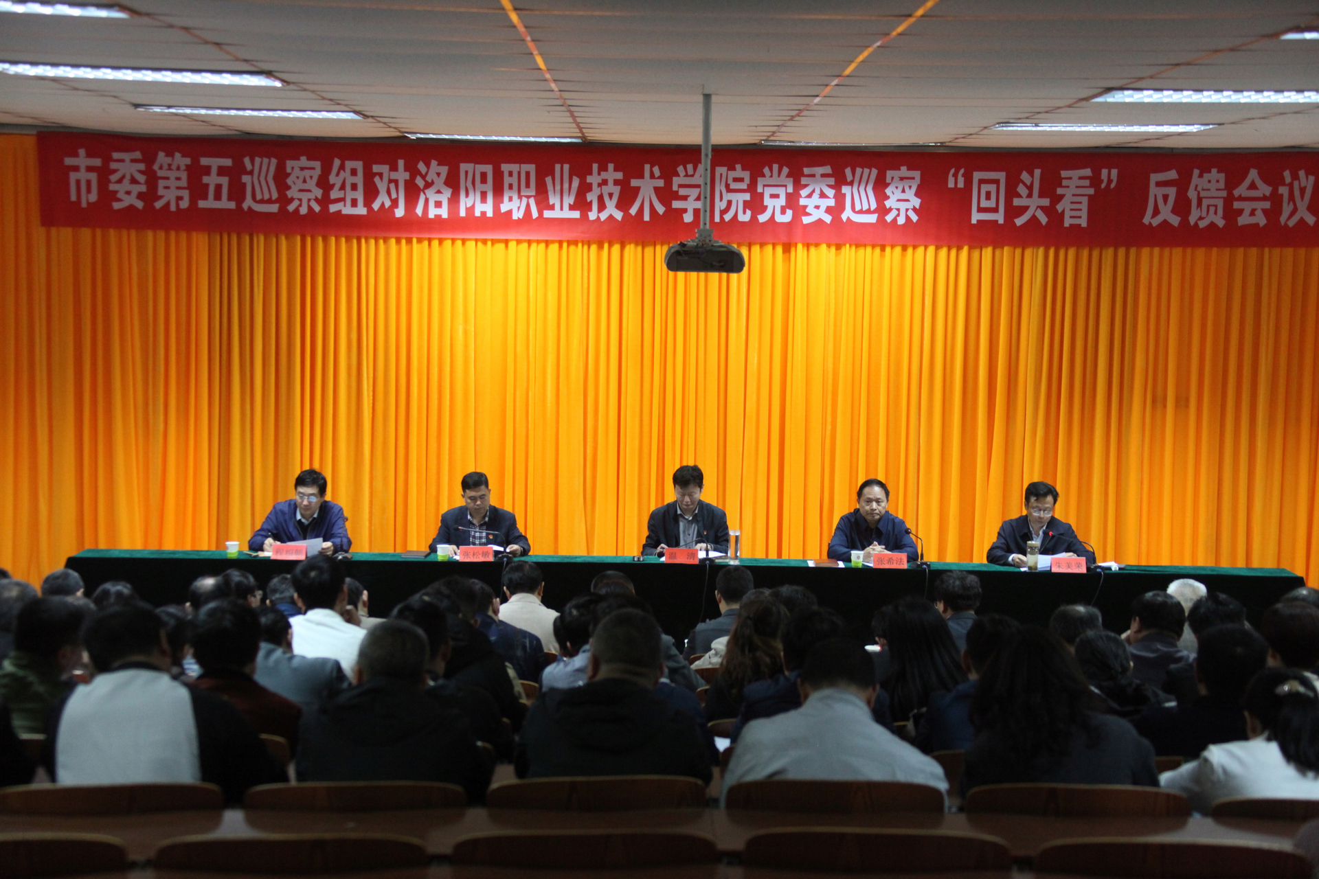 4月24日上午,市委第五巡察组对我院巡察“回头看”情况反馈会在机场校区南院学术报告厅召开。市委巡察工作领导小组成员、市纪委副书记、市监察委副主任温清同志向学院党委书记朱美荣传达了市委书记李亚同志在书记专题会上听取本轮巡察情况汇报时的讲话精神,市委第五巡察组组长张希法同志反馈巡察“回头看”情况。之后,张希法同志代表市委第五巡察组向洛阳职业技术学院党委进行了反馈,温清同志对巡察整改工作提出要求。党委书记朱美荣同志主持会议并作了表态发言。