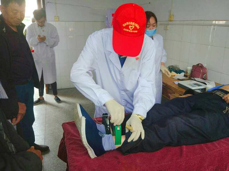 中医社社员帮助义诊医生为老人做心电图检查