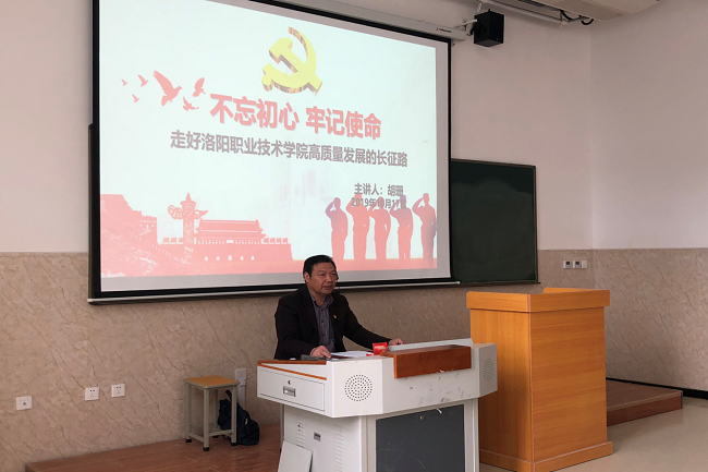 为全面学习贯彻习近平总书记关于“不忘初心、牢记使命”主题教育讲话精神,扎实落实省委、市委及学院相关会议精神及实施方案,10月17日,学院党委副书记胡珊以《不忘初心、牢记使命——走好洛阳职业技术学院高质量发展的长征路》为题,在伊滨校区2号教学楼205教室,为信息技术与城建学院及全体思政部教师讲授主题教育专题党课。党课由信息技术与城建学院党总支副书记付新典主持。