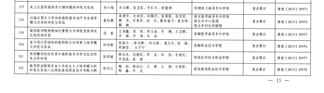 10月31日,河南省教育厅下发了《河南省教育厅关于公布2019年河南省高等教育教学改革研究与实践项目鉴定名单的通知》(教高[2019]740号),我院两项课题均顺利通过鉴定。两项课题中,程相朝教授主持的《基于现代学徒制的高职校企协同育人培养模式研究与实践》为重点课题,张彦芳副教授主持的《以能力为本位的高职护理教育综合改革研究》为一般课题。