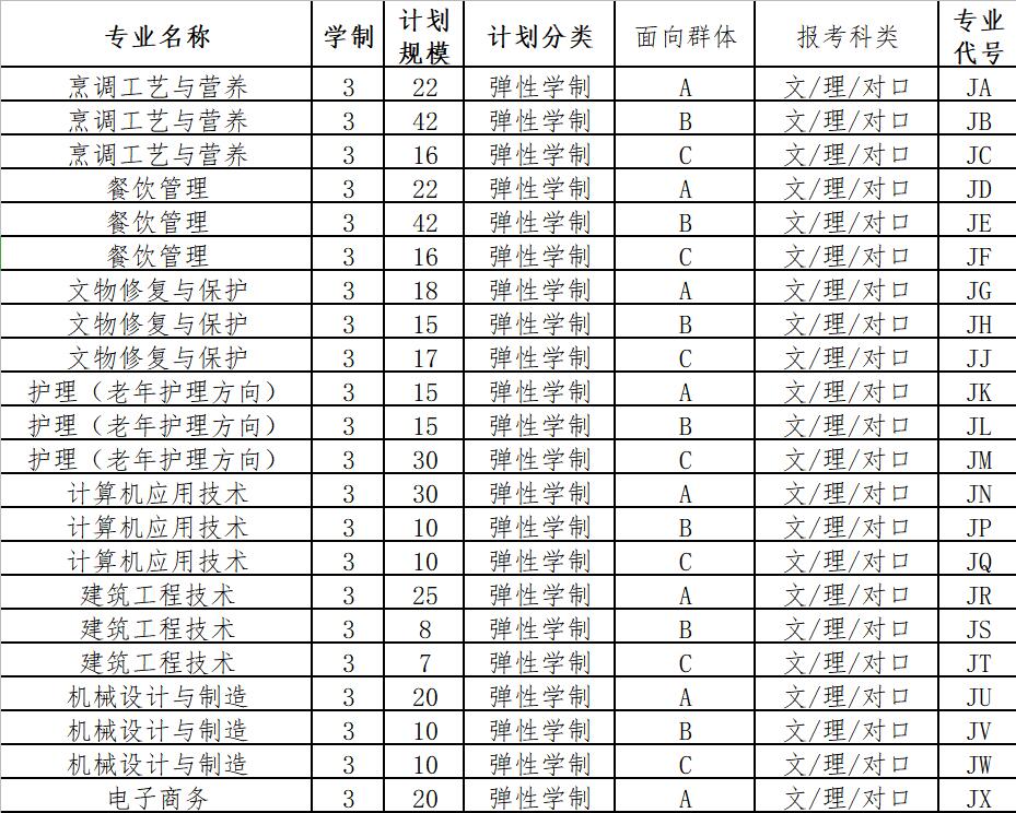 注:A为退役军人可报专业类,B为新型职业农民(含村“两委”干部、新型农业经营主体带头人、乡村社会服务组织带头人、乡村致富带头人、农业技术人员等)可报专业类,C为其他(含应往届高中和中职毕业生、农民工、下岗失业人员、企业在职职工等)群体可报专业类,考生须按个人所属类别分类报考相应专业。