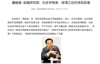 2月17日,洛阳职业技术学院副院长、社科专家韩洪涛教授发表咨询报告《社会学视角:疫情之后的洛阳发展》,该文基于疫情对洛阳造成的影响,结合马克思主义政治经济学的基本原理和社会学关于社会运行及社会治理的有关理论,分析了洛阳的既定方针和疫情新课题,提出了“尽快走出‘疫情’恐慌,完善社会治理体系,促进社会秩序和经济发展的双向恢复;牢牢把握不断满足‘人民群众对美好生活的向往’的目标定位,率先构建‘美好生活经济新业态’;实行更为积极的财政政策,加大以‘新基础设施’为代表的公共服务领域投资;统筹各方力量,救助中小微企业;适时大力开展职业培训,缓解就业的压力;提前筹划年内重点产业复苏方案”等六个方面建议,为疫情后洛阳市经济、社会发展出谋划策。目前,该文已被数十家媒体网站转载报道,积极引导社会舆论,提振民众信心。