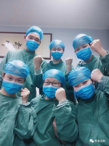 上图左一为洛阳市东方医院肿瘤血液介入中心王亚伟,是我院 2016级大专护理13班毕业生,刚刚走向工作岗位,同样在这次疫情期间,作为一名男护奋战在一线。