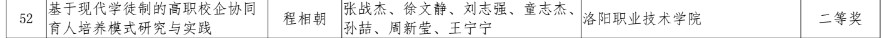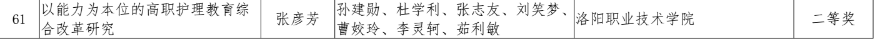 在学校评选推荐校级教学成果奖励的基础上,经过学校申报、专家评审,最终全省有263项省级教学成果入选2019年河南省高等教育教学成果奖。其中,程相朝院长主持的《基于现代学徒制的高职校企协同育人培养模式研究与实践》、医学院张彦芳院长主持的《以能力为本位的高职护理教育综合改革研究》两项课题入选2019 年河南省高等教育(高等职业教育)教学成果二等奖。