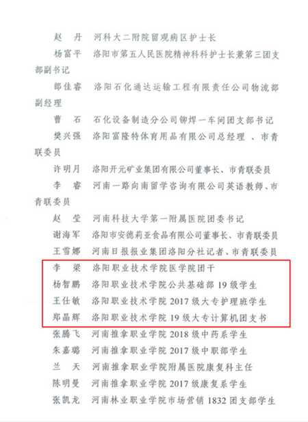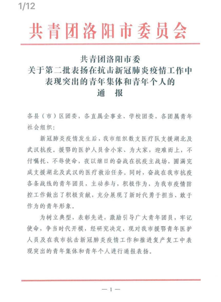 为树立典型,表彰先进,激励引导广大青年团员,牢记使命,争当时代楷模,共青团洛阳市委现对洛阳市援鄂青年医护人员及在洛阳市抗击新冠肺炎疫情工作和推进复产复工中表现突出的青年集体和青年个人进行通报表扬,其中就有洛阳职业技术学院四名同学。