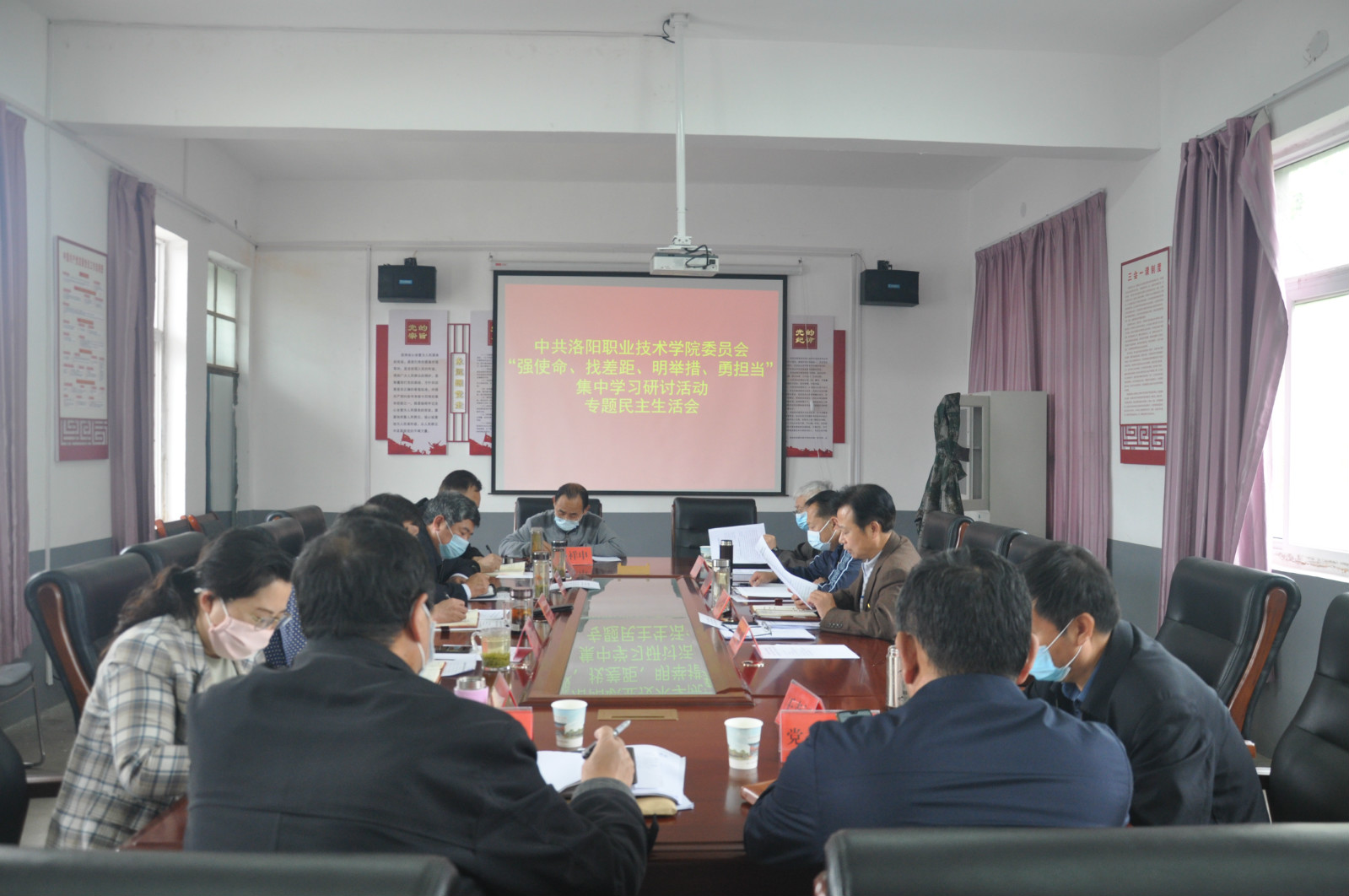 根据洛阳市“强使命、找差距、明举措、勇担当”集中学习研讨活动领导小组办公室工作安排,5月9日下午,学院领导班子召开了“提高站位强使命、解放思想找差距、开放引领明举措、立足本职勇担当”集中学习研讨活动专题民主生活会。