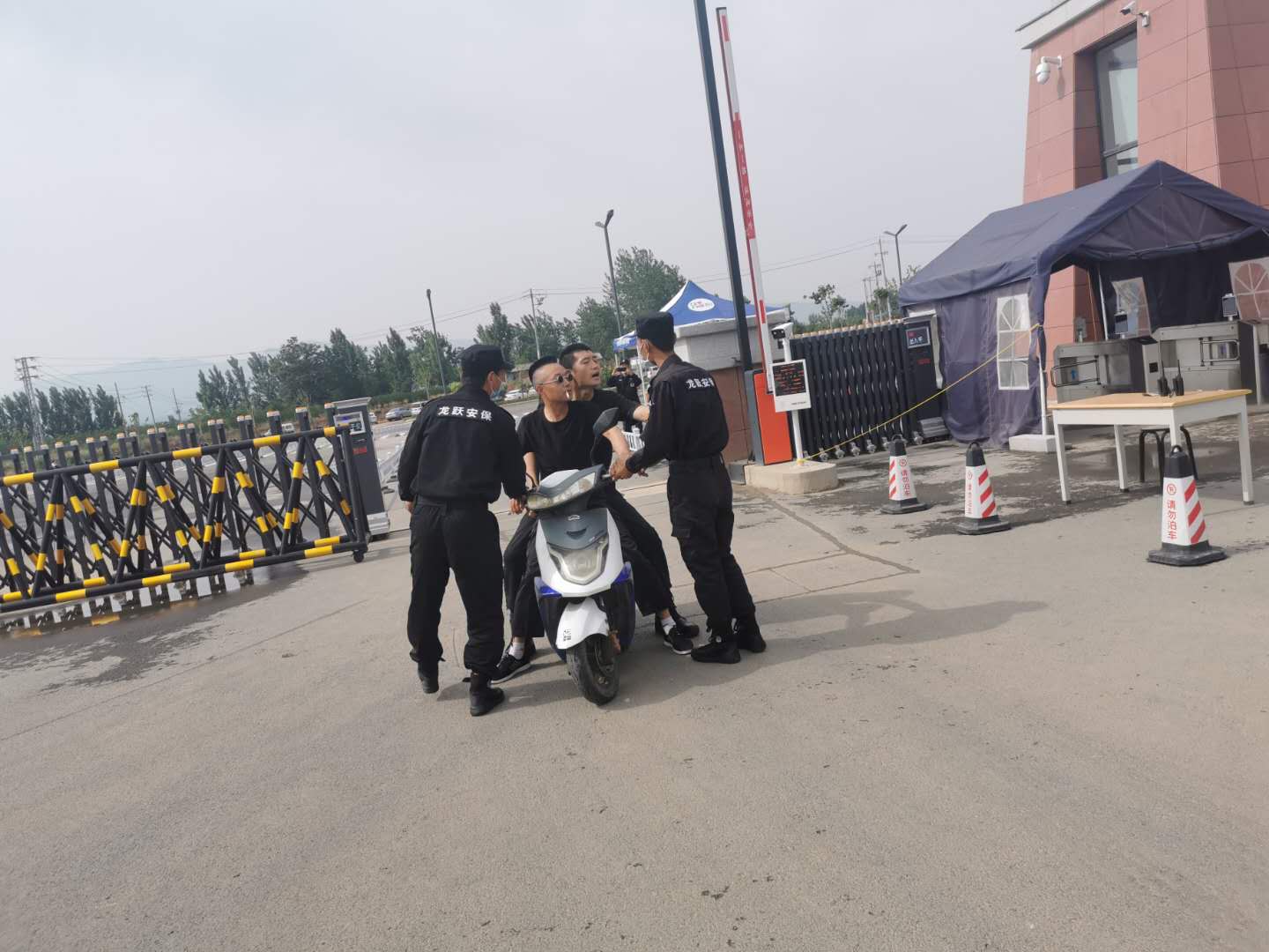 9点15分,两名校外人员骑车要进入学校大门,以进去“找人”的理由被值班保安拦住盘查,两人无牌无证,拒不配合检查,被值班安保人员拒绝后,二人强行闯入校门并持械殴打保安人员,安保队员发出报警请求支援,闻讯驾驶巡逻车赶来的防暴队员们临危不惧,合力使用防暴叉、盾牌及抓捕器等防恐防暴器材合力制服并将两名歹徒原地控制,直到110车辆的到来。