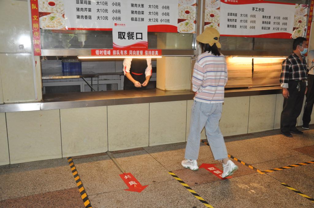 第四站:进入餐厅演练。安排了入场、洗手、取餐、用餐和消杀等环节。餐厅内人员实行单向流动,除就餐时需佩戴口罩。按地面标线间隔一米取餐,使用一次性餐具。
