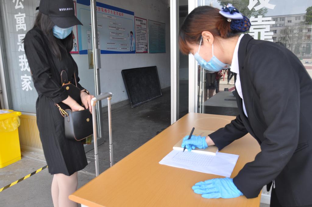 第二站:进入公寓演练。学生在公寓门口进行第三次体温测量,然后依次进入宿舍。在宿舍,网格长按照要求让大家测量体温,并安排宿舍出现“发热”学生应急模拟场景。宿舍由值班人员定期进行消杀。