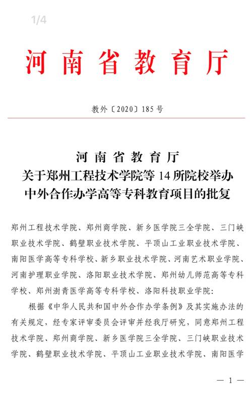 近日,省教育厅印发《关于郑州工程技术学院等14所院校举办中外合作办学高等专科教育项目的批复》(教外〔2020〕185 号),我校与白俄罗斯国立技术大学合作举办的机电一体化和机械设计与制造专业专科教育项目成功获批。