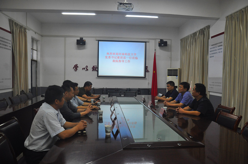 6月22日下午,河南科技大学党委书记崔世忠、党委副书记褚金海一行到我校伊滨校区考察交流。党委书记朱美荣、院长程相朝、副院长韩洪涛、纪委书记王晓哲参加交流活动。