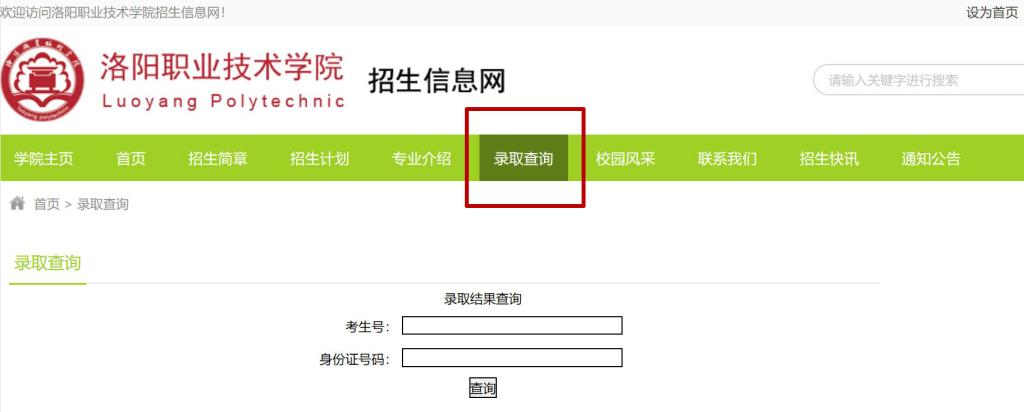 查询办法:登陆洛阳职业技术学院招生信息网,点击录取查询,使用考生号和身份证进行拟录取结果查询。