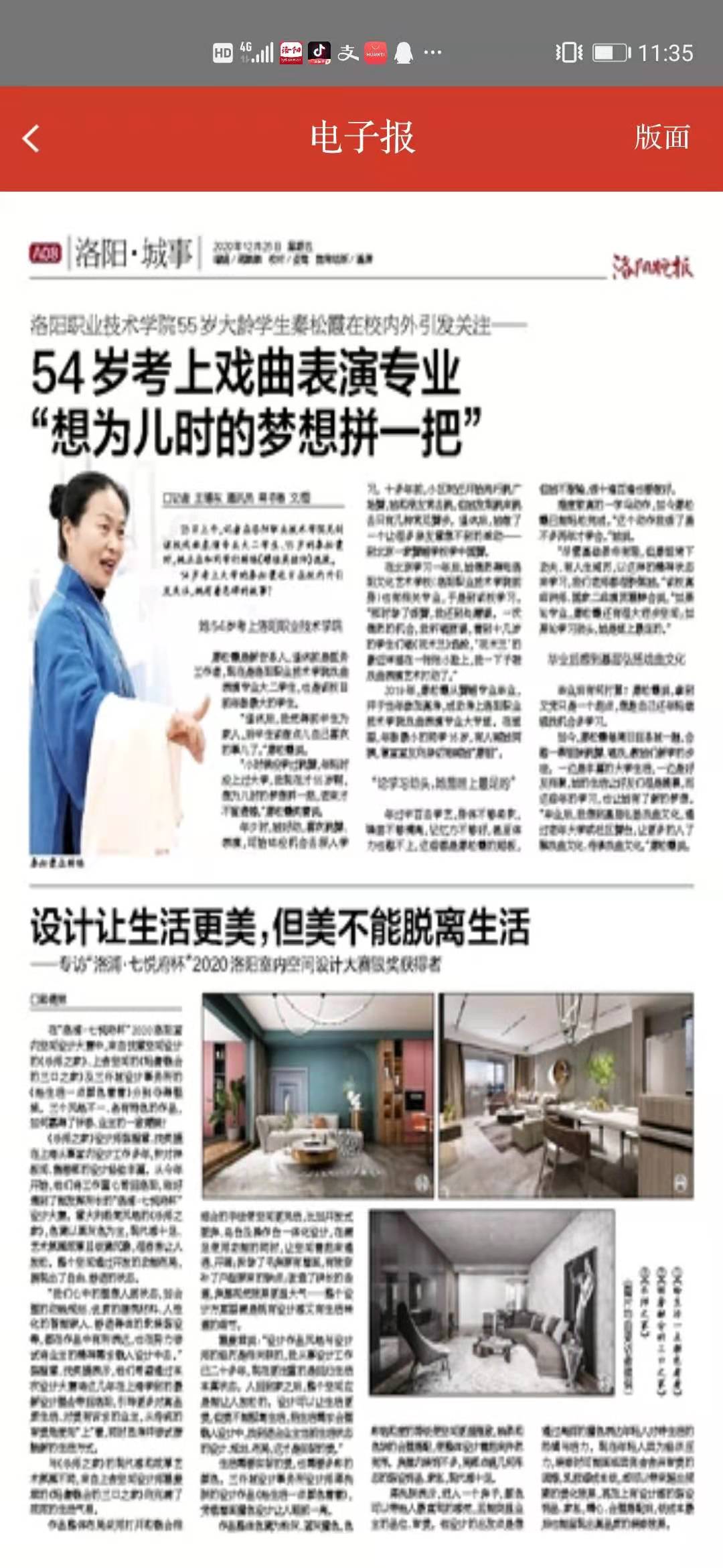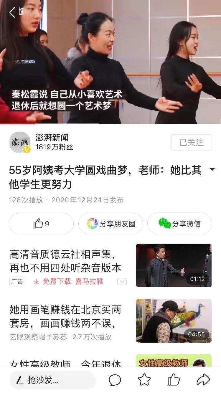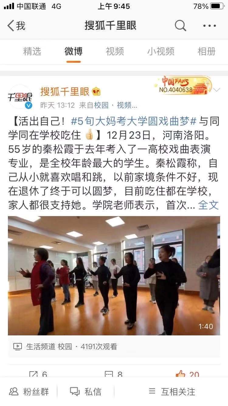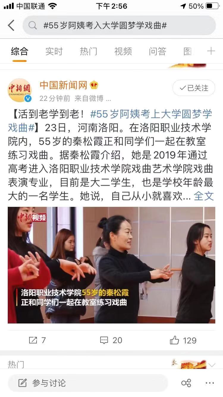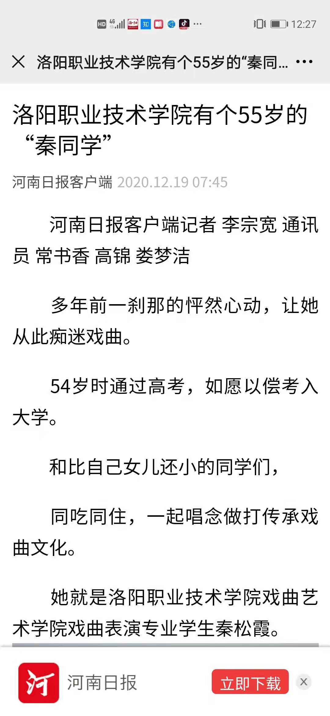 河南日报客户端、河南省教育厅、澎湃新闻、中国新闻网、洛阳晚报、梨视频、荔枝新闻、网易新闻、河南商报快手号、洛阳网、时间视频等媒体报道我校戏曲艺术学院55岁大龄女生秦松霞的故事。相关报道截图如下: