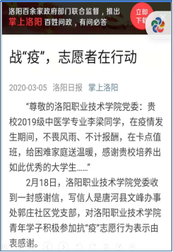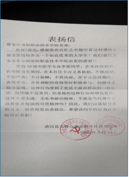 因疫情期间表现优秀,河南省南阳市唐河县文峰街道办事处郭庄社区党支部和唐河县志愿者协会给李梁以及我校党委写了感谢信,《洛阳日报》也报道了李梁的事迹。