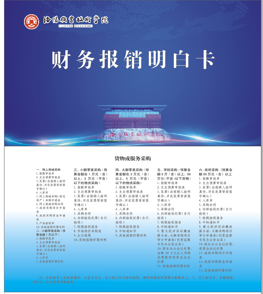 为给广大师生提供便捷的财务办事环境,避免二次往返,提高报账效率。计划财务处针对日常报账频率较高的差旅费、货物或服务采购等业务,制作了财务报销“一次性告知”明白卡。明白卡中明确了差旅费、货物或服务采购类业务所需的报销资料。有需求的师生可以到图文信息大楼财务办事大厅(807室)领取。同时,也可到学院官网计划财务处专栏下载明白卡电子版。