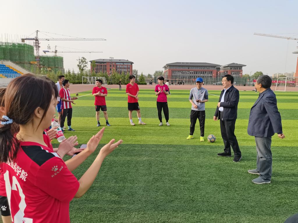 4月16日下午,河南科技大学教工足球队来校,与我校女子足球队在足球场进行了一场别开生面的足球交流赛。院长程相朝、纪委书记王晓哲亲临现场指导慰问。