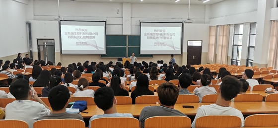 会上,南京金斯瑞生物科技有限公司人事部门负责人向大家介绍了公司的发展历程、公司实力、工作环境、待遇薪资等等,同学们针对入职后的个人发展、职业前景等方面展开交流。