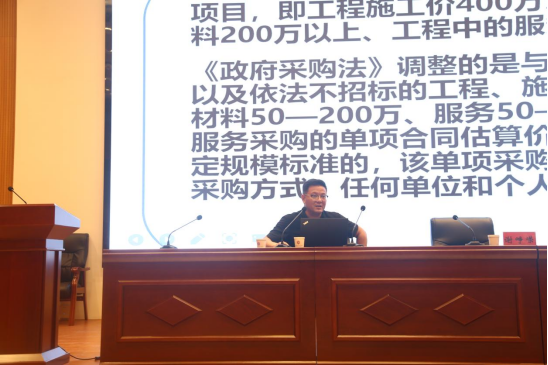 为进一步规范学院政府采购工作,6月23日下午,我校在大学生活动中心举行政府采购业务培训会。市财政局采购科科长王春华、副科长谢峥嵘、科员刘艺璇进行授课。副院长余江宁,各部门负责同志、项目负责人近百人参加会议。