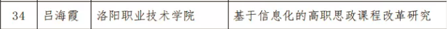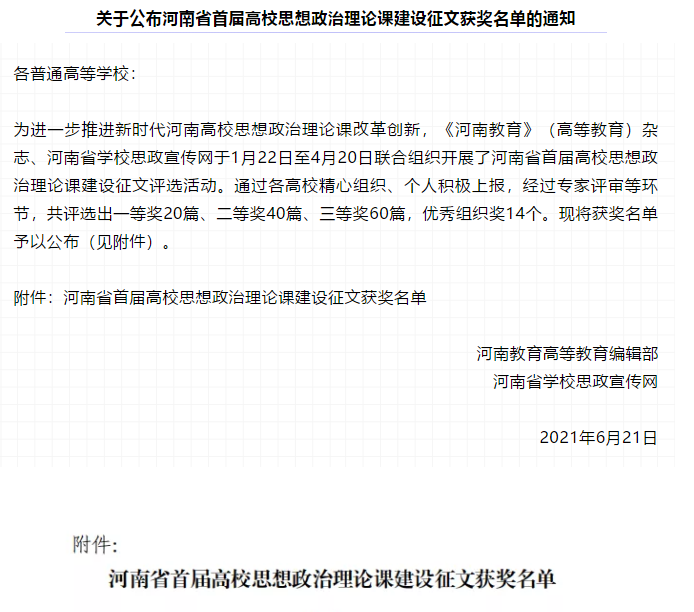 近日,省教育厅公布河南省首届高校思想政治理论课建设征文的获奖结果。我校思政部吕海霞老师的论文《基于信息化的高职思政课程改革研究》获得二等奖,会计学院王希冉老师的论文《“微时代”对高校思想政治理论课教学工作的挑战与对策研究》获得三等奖。