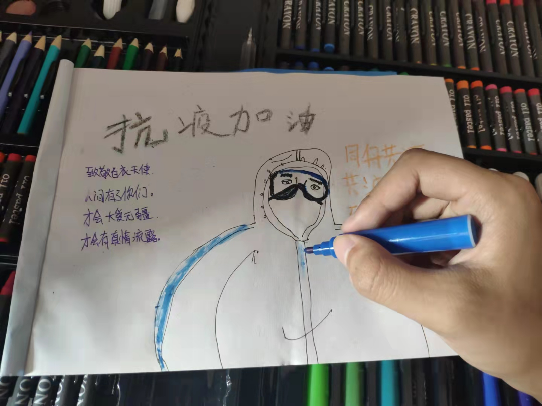 结束了上午的课程,我开始练习画画。在全省人民救灾防疫的紧要关头,我看到了“天使白”“志愿红”“消防橙”“橄榄绿”“救援蓝”绘就的最美彩虹,更读懂了“哪有什么岁月静好,不过是有人替你负重前行”的深刻内涵,希望用手中笔作画来感谢他们的守护。